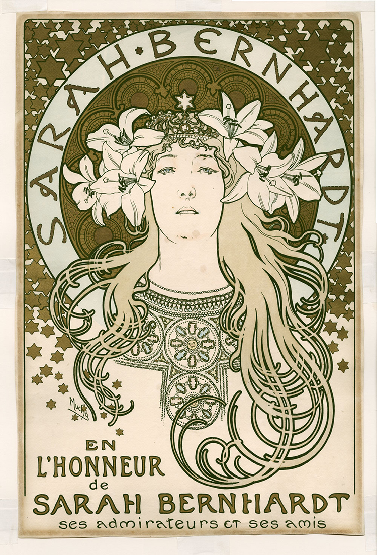 1894年,穆夏為巴黎極富聲望的戲劇明星莎拉·伯恩哈特主演的新年戲劇《吉斯蒙達(dá)》設(shè)計(jì)海報(bào),獨(dú)特的風(fēng)格轟動(dòng)巴黎,兩位巨匠開(kāi)啟長(zhǎng)達(dá)六年的合作。