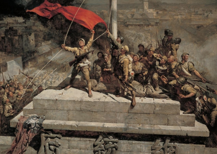 《占領(lǐng)總統(tǒng)府》陳逸飛魏景山 1977年(復(fù)制品,由中國人民革命軍事博物館提供)布面油彩
