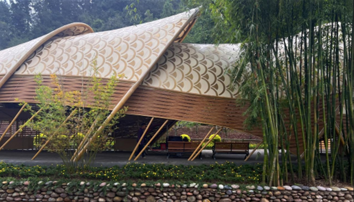 最富創(chuàng)意的當(dāng)數(shù)“草龍市集”,這是一個(gè)超大體量的鄉(xiāng)村市集,一個(gè)集文創(chuàng)、農(nóng)產(chǎn)品市集、特色文化景點(diǎn)為一體的綜合活動(dòng)空間。創(chuàng)作靈感來(lái)源于當(dāng)?shù)貒?guó)家級(jí)非物質(zhì)文化遺產(chǎn)“沐川草龍”,以“龍身竹體”的形式呈現(xiàn)靈動(dòng)通透的外觀,傳達(dá)了源自于草龍精、妙、奇、神的特點(diǎn),打造富有藝術(shù)氣息的本地特色市集。草龍市集主體采用了不同直徑的鋼管經(jīng)過(guò)雙曲拉彎、塑型等特殊工藝制作成仿真竹節(jié),以此達(dá)成竹節(jié)的藝術(shù)化處理,同時(shí)具備防腐、承重、抗風(fēng)抗震等功能。外部棚頂取自龍鱗抽象化的視覺(jué)元素,里外雙面采用貼面模具打造,以不同大小、角度和造型焊接到金屬竹體結(jié)構(gòu)上。整個(gè)市集基于人體工學(xué)、材料學(xué)等交叉學(xué)科的應(yīng)用性科學(xué)測(cè)試,確保安全。此外,龍頭采用亞克力立體字體,龍尾采用當(dāng)?shù)靥厣袼囍谱髋曝遥⑶也捎盟囆g(shù)吊燈、LED燈帶等配飾營(yíng)造古典,并兼顧現(xiàn)代科技的東方美學(xué)風(fēng)格。市集總長(zhǎng)50.515米,寬9.939米,總高8.274米,總面積達(dá)502平方米,開(kāi)闊的空間尺度配合通透的結(jié)構(gòu)充分展現(xiàn)出舞耍草龍的靈動(dòng)性,也完善了鄉(xiāng)村市集的功能。何焰率中農(nóng)農(nóng)旅團(tuán)隊(duì)設(shè)計(jì)建造的草龍市集因此也超越了普通鄉(xiāng)村市集,以龍騰竹影般的藝術(shù)氣質(zhì)彰顯文化的傳承與創(chuàng)新。這些景觀節(jié)點(diǎn)宛若一顆顆璀璨的星星,不僅美化了鄉(xiāng)村環(huán)境,更吸引眾多游客慕名而來(lái),激活當(dāng)?shù)亟?jīng)濟(jì)。