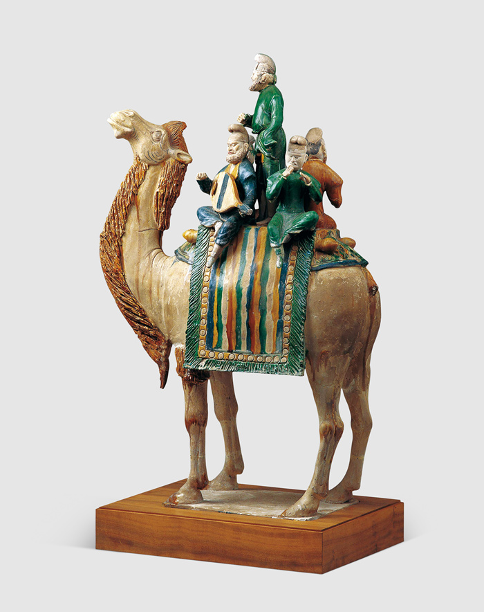 唐代的三彩釉陶器,我們常稱之為“唐三彩”。這種陶器造型精美、色彩亮麗,充滿生命力。這件三彩釉陶駱駝?shì)d樂俑,又是眾多三彩器中頗為新穎獨(dú)特的一件。從它身上,我們能看到怎樣的時(shí)代氣象呢?
