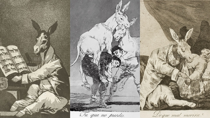 “驢”的意象成為貫穿龔若愚創(chuàng)作的核心隱喻。這一形象其實(shí)在藝術(shù)史中并不少見(jiàn),給人印象最深的是弗朗西斯科·戈雅(Francisco Goya)的《狂想曲》(Los Caprichos,亦譯為《奇想集》),他通過(guò)寓言中動(dòng)物和夸張的角色來(lái)影射所謂文明社會(huì)中的弊病和荒謬,而戈雅筆下的驢常指涉那些缺乏獨(dú)立思考、盲目追隨權(quán)威或傳統(tǒng)的人。