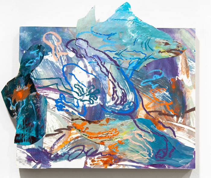 除此之外,他還通過(guò)拼貼元素進(jìn)一步打破作品的邊界:調(diào)色盤殘骸被剪裁為不規(guī)則形狀,轉(zhuǎn)印復(fù)刻的亞克力版在肢解后被嵌入畫面……龔若愚形容自己的創(chuàng)作為一種冥想與內(nèi)觀:“腦海中的場(chǎng)景就如同拼貼一樣從來(lái)不是規(guī)則的,它的形狀正契合了我的情緒邊界。”