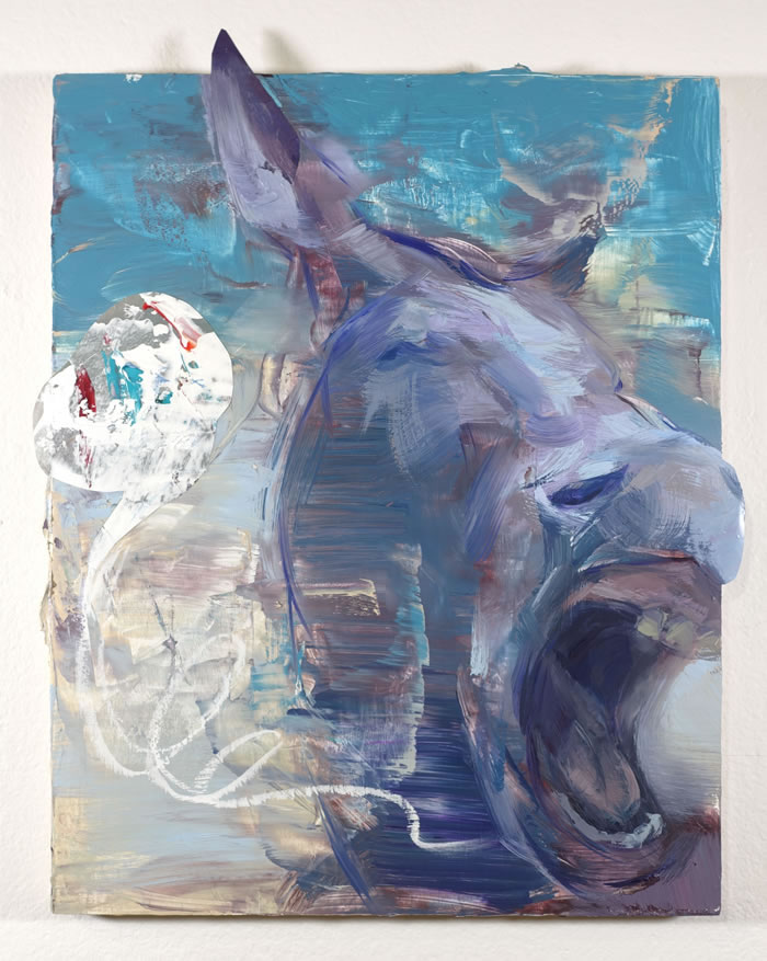 第一次看到龔若愚的畫,就被他畫面上迸發(fā)出的情緒牢牢抓住。那是他2024年底的一系列作品,藍(lán)驢的形象以不同形態(tài)出現(xiàn)在畫面中,有的脖子上墜著鈴鐺、有的雙眼蒙上眼罩,作品特意突破畫框邊界進(jìn)行了雕塑和綜合材料的拓展,更加劇了整體的視覺(jué)沖擊感,似乎隔著屏幕都能聽(tīng)見(jiàn)驢子的嘶吼聲。