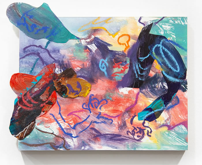 無(wú)疑,若愚筆下的驢是具有象征意味的。而他近期在紐約A Space Gallery舉辦的最新個(gè)展“笑點(diǎn)之下”(Beneath the Punchline)則讓人看到在不到一年的時(shí)間里這位青年藝術(shù)家的探索和蛻變。在具象與抽象,視覺(jué)與語(yǔ)言的轉(zhuǎn)譯之中,他的作品更加成熟而松弛,更重要的是,隨著形象的隱匿,潛意識(shí)浮現(xiàn)并得以于伸張真實(shí)的自我,讓我們聆聽(tīng)到“笑點(diǎn)之下”,一位游走于中美藝術(shù)教育背景下的青年藝術(shù)家的困境、掙扎、黑色幽默中的自嘲,與篤信當(dāng)下的執(zhí)著。