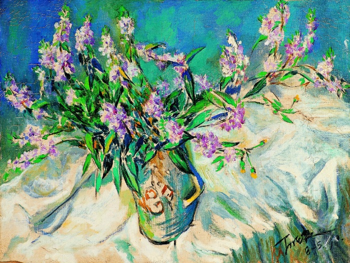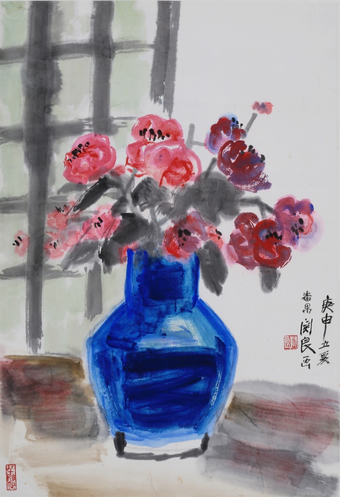 關(guān)良是融匯中西繪畫的大師,靜物也是他重視的題材,《月季花瓶圖》吸取了油畫的筆觸和塑造方式,色彩單純絢爛,融入了墨色和環(huán)境色?;ㄆ颗c花朵矗立正中,展示出怒放的生命力,背后的窗外,則是生機(jī)盎然的綠色和希望。