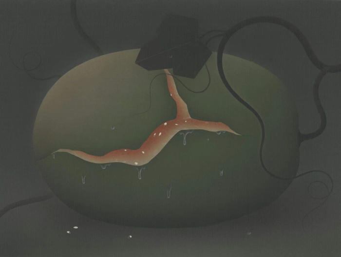 隨著時(shí)代的變遷,靜物的含義和表達(dá)方式正在不斷延展。曾志欽的作品多籠罩在黑色背景中,幾何化的造型頗具形而上氣質(zhì),裂開的瓜預(yù)示著過度成熟、碰撞、迭代、緊張。李易紋用冷峻的眼光描繪日常一瞥捕捉到的事物,它們看似微不足道,卻總是在庸碌的生活中激起漣漪。