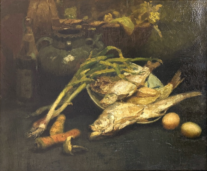 尚揚(yáng)大學(xué)的第一張作業(yè)厚重深沉,像是在畫一場關(guān)于靜物的儀式。這張畫里的魚干、雞蛋在當(dāng)時(shí)都是相當(dāng)珍貴的,能感覺到畫家作畫時(shí)的義無反顧,像是把千鈞之力注入其中,每一處細(xì)節(jié)、虛實(shí)都處理得相當(dāng)用心,無可挑剔。