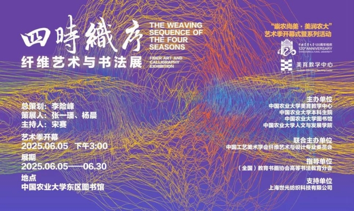 “四時織序——纖維藝術(shù)與書法展”圍繞“春生、夏長、秋收、冬藏”共設(shè)四個主題,匯集中國農(nóng)業(yè)大學(xué)、清華大學(xué)、北京大學(xué)、中央美院、中國美院、西安美術(shù)學(xué)院等八所高校近40件藝術(shù)作品,通過豐富的視覺與感官效果,帶大家走入傳統(tǒng)文化與藝術(shù)創(chuàng)新融合的美妙世界。展覽中的纖維藝術(shù)作品將編織、扎染等傳統(tǒng)工藝與數(shù)字技術(shù)相融合,展現(xiàn)出農(nóng)業(yè)可持續(xù)發(fā)展的創(chuàng)新探索;書法作品通過篆隸楷行草不同字體,傳承“農(nóng)為邦本”的文化根脈的同時書寫出“強農(nóng)有我”的新時代答卷。策展人張一璠、楊晨特別創(chuàng)作的纖維藝術(shù)作品《四時好景·百廿華章》,是為農(nóng)大百廿校慶的特別獻禮,作品以針織工藝和草書動態(tài)結(jié)構(gòu),將農(nóng)大百年歷程凝練為四季意象——春生(建校育人)、夏長(學(xué)科深耕)、秋收(科技突破)、冬藏(文明積淀),帶領(lǐng)觀眾穿越時空,重溫“解民生之多艱”的初心。