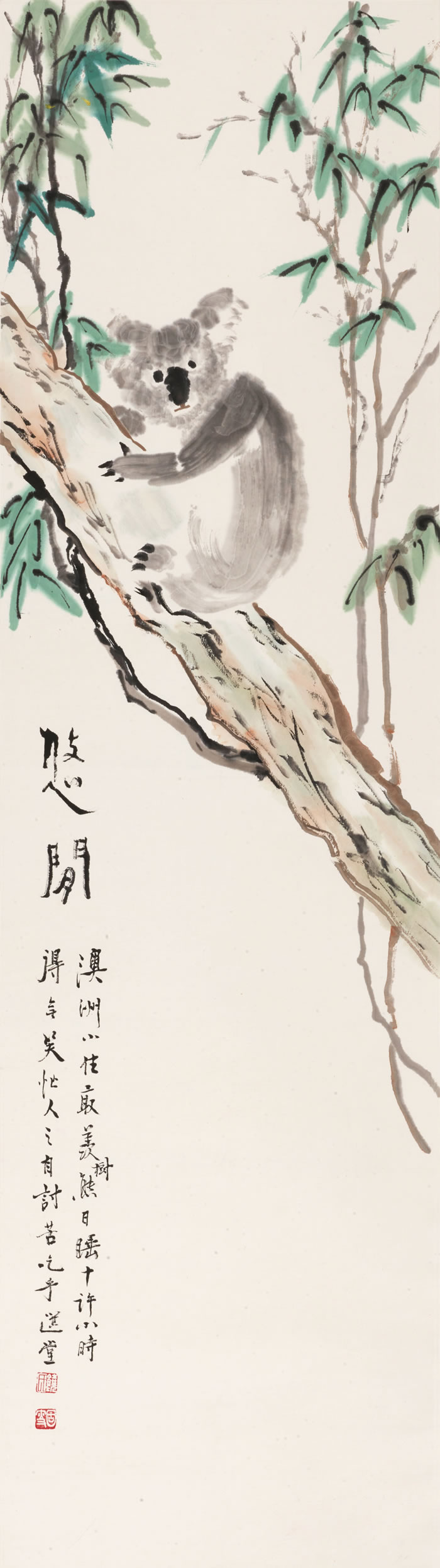 款識:悠閑。澳洲小住,最羨樹熊日誰十許小時,得無笑忙人之自討苦吃乎,選堂。