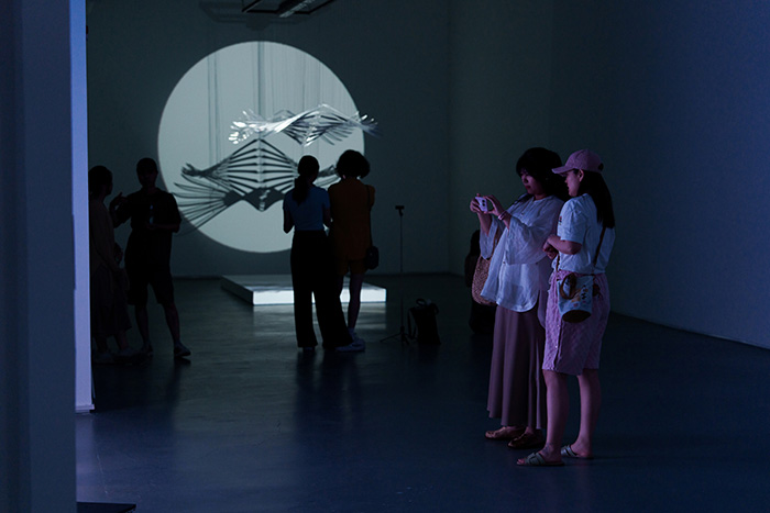 “.GIF”作為數(shù)字早期圖像格式,以低技術(shù)門(mén)檻和高傳播效率流行,其循環(huán)播放機(jī)制成為“變化”觀看方式的隱喻——一種不斷更新的視覺(jué)經(jīng)驗(yàn)與意義生成方式。此次展覽邀請(qǐng)段少鋒、辛云鵬、孫文杰三位充滿活力的策展人共同策劃,11位 /組藝術(shù)家以 AI算法、機(jī)械裝置等多元手段創(chuàng)作。作品或互動(dòng)或疏離,以搖擺、旋轉(zhuǎn)或細(xì)微變化挑戰(zhàn)感知邊界。展覽跳出“動(dòng)態(tài)裝置”傳統(tǒng)框架,強(qiáng)調(diào)“運(yùn)動(dòng)”作為作品的結(jié)構(gòu)語(yǔ)言,引導(dǎo)觀眾超越對(duì)“動(dòng)”的直覺(jué),重新思考時(shí)空與身體感知的關(guān)系,呼應(yīng)社會(huì)科技演進(jìn)中感知持續(xù)更新的生存處境。