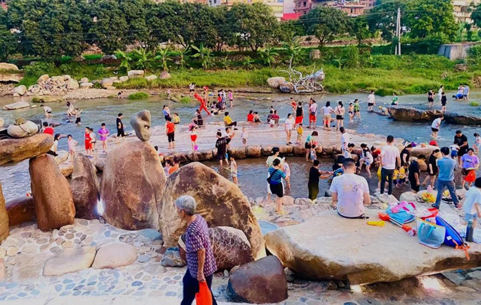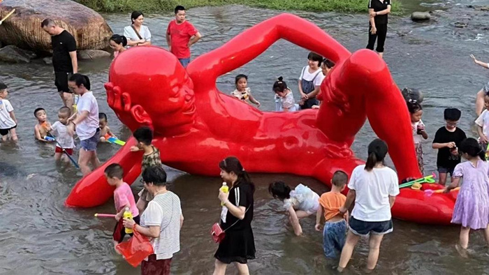 “金谷溪岸”的藝術品與美術館中的作品不同,置身于真實的鄉(xiāng)土語境中,其意義被進一步放大。游客的拍照打卡、孩童的嬉戲觸摸、村民的集體參與,都在解構和重構作品原本的嚴肅性——藝術在這里既是批判的載體,也成了大眾狂歡的符號。這種矛盾恰恰揭示了當代藝術在公共空間中的雙重性:它能否超越“網(wǎng)紅效應”,真正觸發(fā)深層思考?
