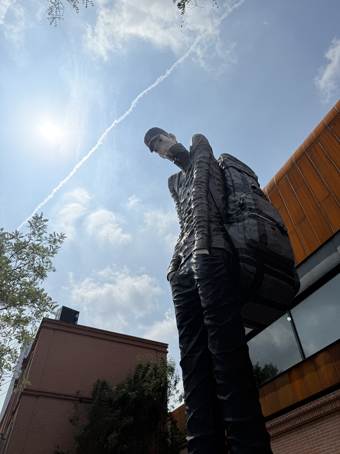 如果你從天緯路走進(jìn)這片街區(qū),立刻會(huì)被路口邊這件名為《都市主人翁》的作品吸引。一個(gè)身高超出街邊綠樹(shù)的年輕人形象,身背重重的旅行包,立于街邊,低頭踟躕,當(dāng)觀眾抬頭仰望的瞬間,目光與之交疊。藝術(shù)家王坤昭將都市里奔忙的靈魂定格成永恒的剪影,拉長(zhǎng)的高大身影背著生活的行囊走向下一個(gè)轉(zhuǎn)角。每個(gè)人是都市主人翁,也是遷徙者,穿行于鋼筋水泥叢林中。