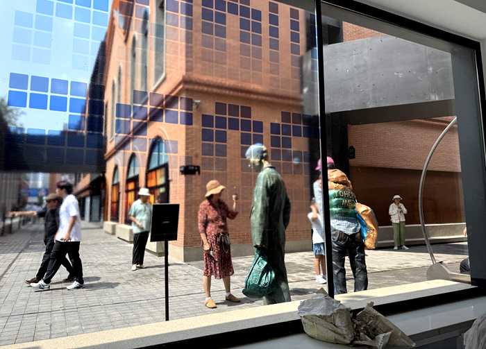 蘇新平《行走的人》與遠(yuǎn)處的高樓、建設(shè)工地形成對(duì)話場(chǎng)域 攝影:許柏成