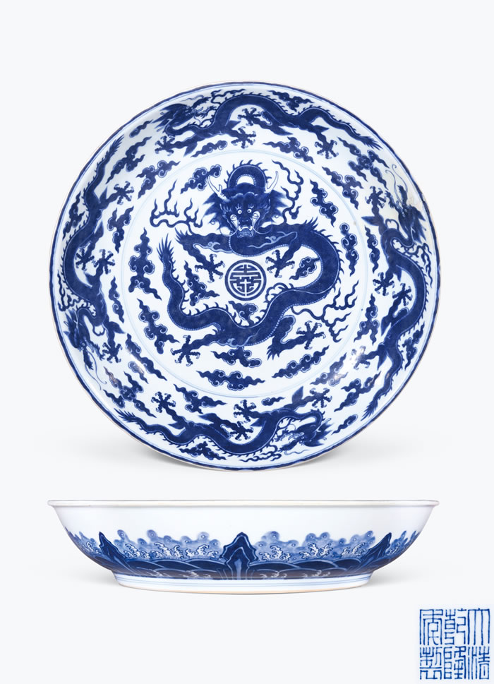 “瓷器玉器工藝品”是一個包羅瓷器、玉器、竹木器、掐絲琺瑯等多個收藏門類的專場。此次瓷器部分封面作品,清乾隆青花云龍捧壽圖大盤,從其云龍捧壽的裝飾元素,推測其很有可能為宮廷舉辦壽宴及特定隆重的祝壽場合所定燒使用之物,足見其不凡的檔次和級別。而雜項部分,清乾隆 剔紅會昌九老圖、云龍紋、九秋圖、荔枝紋扇骨一套四把,扇骨十三檔,圓頭式,圓釘,以竹為胎、剔紅工藝而制,四把兩面皆剔紅雕會昌九老圖、云龍紋、九秋圖、荔枝紋圖,畫意明晰,格調古雅,極具文人氣息。