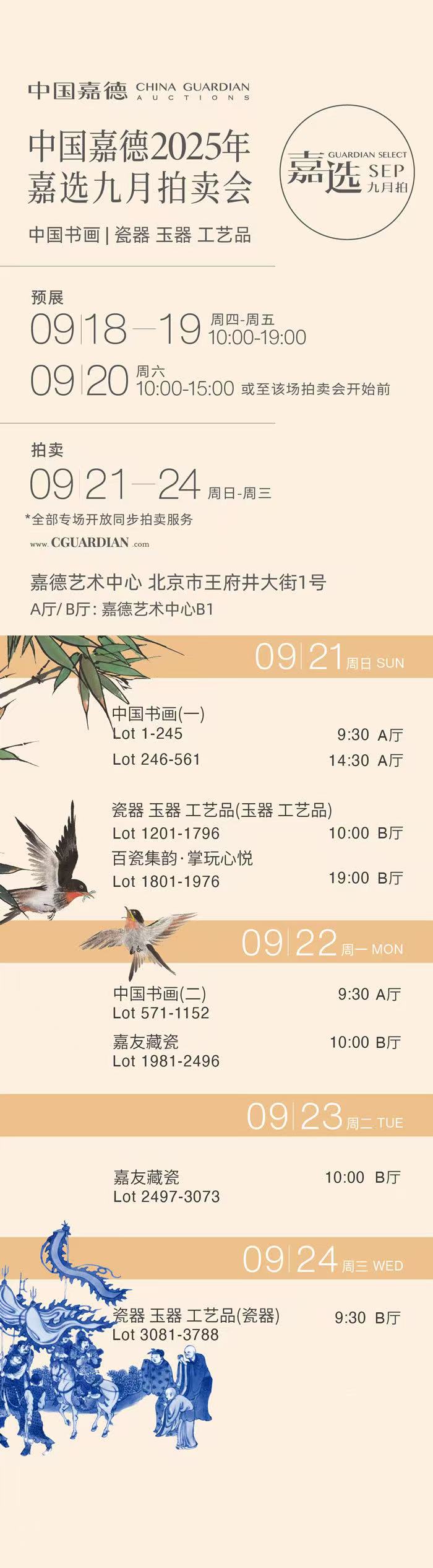 中國嘉德“嘉選”九月拍賣會即將開啟——5大專場,3700余件藏品整裝待發(fā)。9月18日-20日預展及9月21日-24日拍賣將于嘉德藝術中心如期而至。