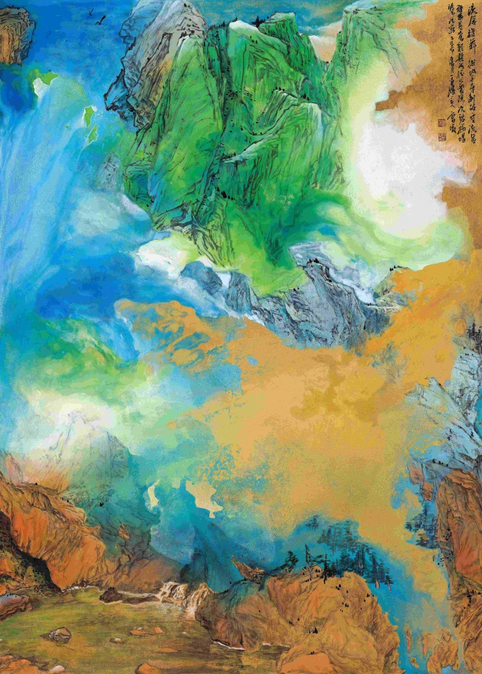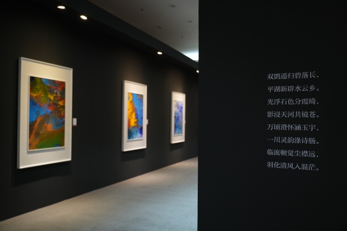 走進(jìn)展廳,中國(guó)傳統(tǒng)繪畫的古典味道融匯著現(xiàn)代生活的審美氣息撲面而來(lái)。本次展覽共展出76幅作品,飽含新宋式系列、宇宙系列、荷花系列、屏風(fēng)系列、書法系列五個(gè)系列。其中“新宋式系列”代表作《流金旋舞》《云扶玉嶂》意境悠遠(yuǎn),渾然天成。此次展出了藝術(shù)家精心創(chuàng)作的十幅震撼人心的潑彩山水。