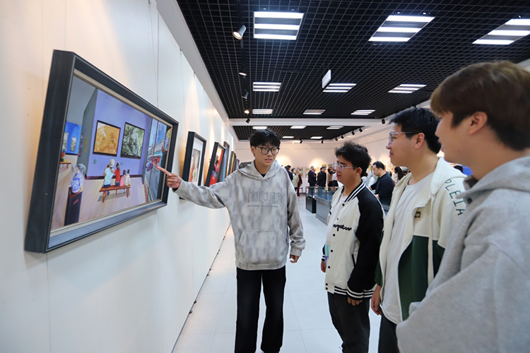 展覽現(xiàn)場,創(chuàng)作者為現(xiàn)場觀眾耐心細(xì)致地講解畫作背后的故事。參觀者悉心聆聽,不時(shí)拿出手機(jī)記錄畫作細(xì)節(jié),遇到感興趣的內(nèi)容還會(huì)主動(dòng)與創(chuàng)作者交流——有觀眾好奇巴拿馬運(yùn)河畫作中船閘的運(yùn)作原理,創(chuàng)作者便結(jié)合當(dāng)?shù)氐乩硖卣髋c航運(yùn)歷史細(xì)細(xì)解答;也有觀眾分享自己游覽揚(yáng)州古運(yùn)河的經(jīng)歷,與創(chuàng)作者探討運(yùn)河景觀在不同文化語境下的藝術(shù)表達(dá),展廳內(nèi)滿是跨文化交流的熱烈氛圍。