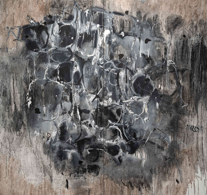 徐善循將自己的抽象繪畫(huà)命名為“鴻蒙系列”,該系列開(kāi)始于2023年。經(jīng)過(guò)十多年的錘煉,這類(lèi)創(chuàng)作已臻成熟?!安菽净揖€”是徐善循發(fā)明的用于創(chuàng)作抽象繪畫(huà)的材料和形式,通過(guò)這種獨(dú)特的材料和形式,他創(chuàng)造了一種新穎別致的抽象繪畫(huà)風(fēng)格。黑白線條依然是這類(lèi)抽象繪畫(huà)造型的骨干,而作為畫(huà)面的背景或基底,徐善循采用了包括水墨暈染、油彩厚涂和丙烯滴灑在內(nèi)的各種手法,營(yíng)造出一種宇宙蒼茫、鴻蒙未開(kāi)的超現(xiàn)實(shí)意境。