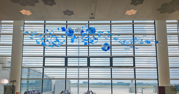 藝術(shù)家把整個(gè)嶺南的春天都掛在了天花板上:這些仿佛被南風(fēng)吻過的藍(lán)色花瓣,藏著不少小心思——它們有著通花瓷般的玲瓏,又帶著麥稈畫的細(xì)膩,每一片都是非遺智慧與未來美學(xué)的混血兒。為了讓這場花雨真正“飄”起來,湖北美院藝術(shù)家團(tuán)隊(duì)玩了個(gè)視覺魔術(shù):用0.3毫米幾乎隱形的鋼絲繩,輕松吊起了整整3噸的裝置。最妙的還是花瓣的“變裝術(shù)”——特調(diào)的“嶺南天色藍(lán)”會隨著天光悄悄改變心情:清晨是暖金色問好,正午是天空藍(lán)微笑。表面那些精密的波浪紋理,更是在地上投下流動(dòng)的光斑。這些會跳舞的花瓣告訴來往的旅人:機(jī)場的春天,從來不會落幕。
