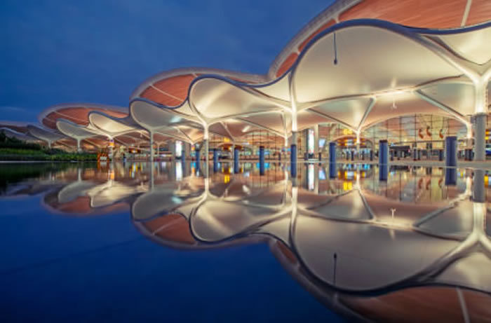 廣州白云國際機(jī)場 T3 航站樓以 “羊城花冠” 為設(shè)計(jì)意象,融入 “云山珠水”“花城” 等城市特色,與綜合交通中心實(shí)現(xiàn)空鐵無縫 “零換乘”。隨著 T3 與第五跑道啟用,白云機(jī)場成為國內(nèi)首個(gè)五跑道航空樞紐,近期年旅客吞吐量達(dá) 1.2 億人次,成為粵港澳大灣區(qū)多元文化交融互鑒的重要樞紐,有力推動(dòng)區(qū)域文化協(xié)同發(fā)展與創(chuàng)新傳承。