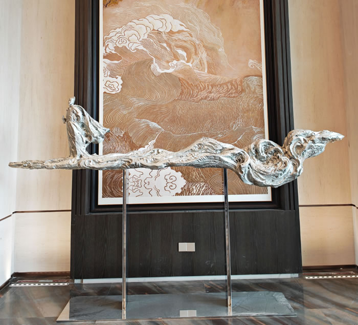 感受過光之宇宙的靜謐,再進(jìn)入貴賓室小憩時(shí),墻上有一面會“動(dòng)”的魔法地圖——中央美院藝術(shù)家團(tuán)隊(duì)把海上絲綢之路的輝煌歷史,“藏”進(jìn)了一幅充滿嶺南韻味的青銅浮雕里。內(nèi)藏的智能LED屏在代碼驅(qū)動(dòng)下,會讓光芒如星圖般點(diǎn)亮,海浪開始流動(dòng),商船仿佛重新啟航。讓青銅的厚重質(zhì)感與數(shù)字光影完美融合,毫無違和。靜態(tài)的浮雕與動(dòng)態(tài)的光影,共同演繹了一場跨越千年的航海史詩。它不只講述歷史,更在向游客低語:廣州的故事,從一開始,就是一場與世界的溫暖握手。