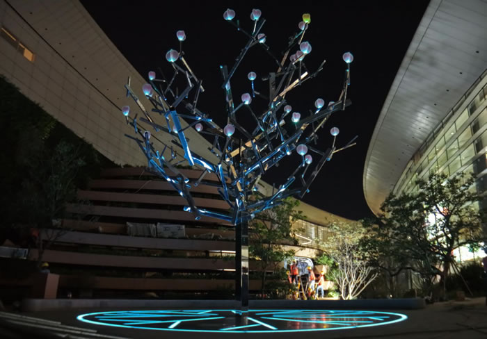 信步至東花園,一棵會“變魔術(shù)”的鏡面樹向空中伸展。它用鏡面“外衣”把花園繁花、流動(dòng)云彩和旅人的身影都“畫”進(jìn)枝干里。廣州美院藝術(shù)家團(tuán)隊(duì)用當(dāng)代設(shè)計(jì)語言重新詮釋嶺南傳統(tǒng)園林的意境。當(dāng)有人走近,腳下的感應(yīng)裝置會觸發(fā)驚喜:數(shù)字化光影如枝葉般搖曳,亞克力花朵輕柔“呼吸”,漫天泡泡折射出夢幻色彩。這棵神奇的樹,用現(xiàn)代的方式演繹著嶺南園林“借景”的古老智慧。它不拒絕任何風(fēng)景,用情歡迎每位路過的友人。
