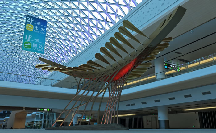 廣州白云機(jī)場 T3 航站樓的公共藝術(shù)體系,展現(xiàn)了空間美學(xué)理論與實(shí)踐相結(jié)合的探索性實(shí)踐。通過系統(tǒng)性的規(guī)劃,藝術(shù)介入空間,將航空樞紐轉(zhuǎn)化為承載文化傳播功能的復(fù)合場域。在創(chuàng)作實(shí)踐中,項(xiàng)目團(tuán)隊(duì)邀請國際頂尖藝術(shù)家參與,運(yùn)用現(xiàn)代藝術(shù)語言解構(gòu)嶺南傳統(tǒng)文化符號,實(shí)現(xiàn)傳統(tǒng)藝術(shù)元素的創(chuàng)造性轉(zhuǎn)化與創(chuàng)新性發(fā)展;同時(shí)整合數(shù)字交互、虛擬現(xiàn)實(shí)等前沿技術(shù),構(gòu)建動(dòng)態(tài)化、沉浸式的文化感知場景,使傳統(tǒng)文化資源獲得新的詮釋載體與傳播路徑。