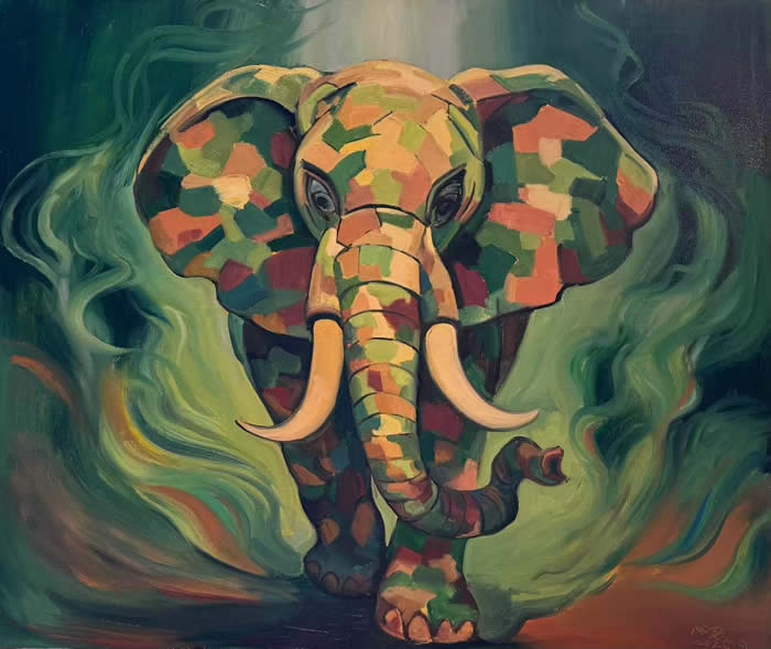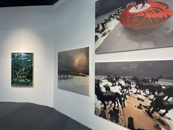 作為本次展覽的發(fā)起人,藝術(shù)家邢俊勤與伊恩·霍華德持續(xù)舉辦了25年的中澳聯(lián)展,每年都會選擇一個不同的主題,在挑戰(zhàn)自我創(chuàng)作的同時也從不同國家背景出發(fā),共同探討人類與社會發(fā)展下的新議題。軍旅藝術(shù)家的身份下,邢俊勤描繪了各種“機械化的動物”,它們棲息在一片經(jīng)過迷彩偽裝的叢林景觀中,而暗紅色的雙眼似乎暗示著對危險的警惕與潛在的危機。在邢俊勤看來,世界似乎正朝著一種新的“叢林秩序”方向發(fā)展,而在這一進程中,人類與動物之間的關(guān)系可能也面臨著新的挑戰(zhàn)。