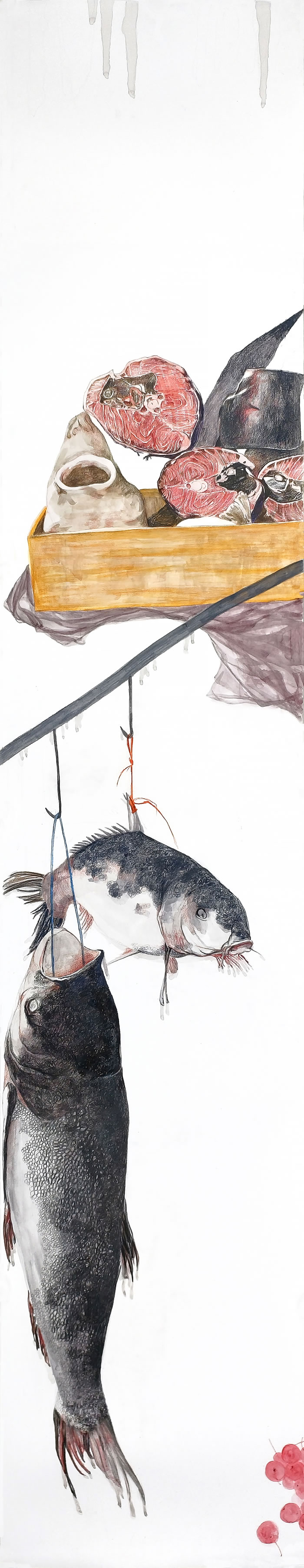近十余年來,李文旻的作品都較傾向于關(guān)注動物及其與人在生活中的關(guān)系。尤其在澳洲生活多年又回到東北老家后,久違的回憶被再次喚醒,經(jīng)過時空周轉(zhuǎn)后重新面對東北特色的早市,令李文旻更加敏感于煙火氣下嘈雜市井中故土獨有的生活畫面——而這里的動物,有和凍梨一起凍得“梆硬”的魚, 有拔了毛兒倒掛的公雞,有案板上的半截兒豬蹄......它們似乎生來便背負著“服務(wù)于人”的命運,在熱鬧的集市上冰冷和被肢解著,真實又那么理所應(yīng)當(dāng)。她的彩色素描將幽默與同情的人類特質(zhì)賦予了每一幅動物場景。令觀者感覺與這些動物如此親近,熟悉它們的日常又或悲慘于其結(jié)局。