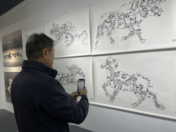 藝術(shù)家蘭錦斌的水墨動物則以“機甲風(fēng)”示人。當(dāng)十二生肖和機甲相合成,當(dāng)紙本水墨線條與理性冰冷的機械構(gòu)件相結(jié)合,強烈的視覺和心理沖擊不言而喻。這些“合成的動物”是時代異化的產(chǎn)物:它們的身體由各種管道、電線和鉚接面板等零件構(gòu)成,似乎足夠自信地展示了當(dāng)前技術(shù)在嘗試模擬動物的生命形態(tài)上所取得的“成果”,然而面對后工業(yè)文明對自然的影響,科技當(dāng)真能夠改變自然甚至物種?這樣的干預(yù)到底孰是孰非?當(dāng)“合成的動物”作為一種科技異化的新物種(比如電子狗),它是否能夠承載傳統(tǒng)“十二生肖”的文化意蘊呢?