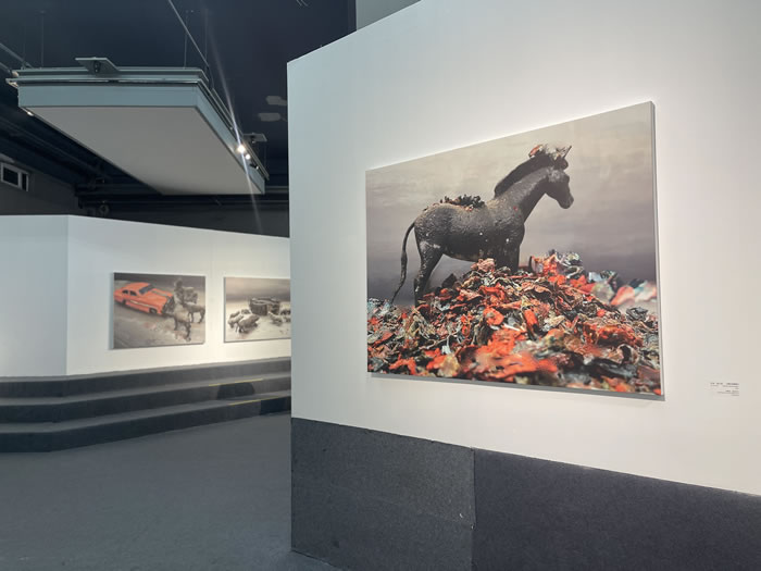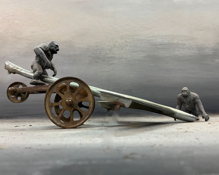 伊恩·霍華德呈現(xiàn)的一系列多媒體數(shù)碼打印作品正面回答了這個問題。藝術(shù)家將語境延展至人類滅絕之后——人類的末日并非世界的末日——因此,藝術(shù)家假設(shè)在人類和其文明消散之后,當(dāng)動物成為地球上的幸存者,它們又將如何看待人類文明的遺存?霍華德在作品中精心布景,通過鏡頭將微縮景觀放大,在特寫和對焦的調(diào)試處理中,作品最終呈現(xiàn)出既真實又虛幻的感受。在《哀悼過去》中,一群犀牛和河馬圍著一輛側(cè)翻的轎車,或抵著頭仔細嗅著它遺存的味道,或徘徊觀望,而遠處的地平線被虛化,在整體混沌的畫面里,這群動物似乎正在為人類文明的遺存“默哀”。在《拾到現(xiàn)成品》里,猴子圍繞著炮彈遺骸,甚至騎在上面正視著觀眾,這樣的“現(xiàn)成品”當(dāng)然令人唏噓,而在與之正視的過程中,又會察覺一絲諷刺與戲謔。