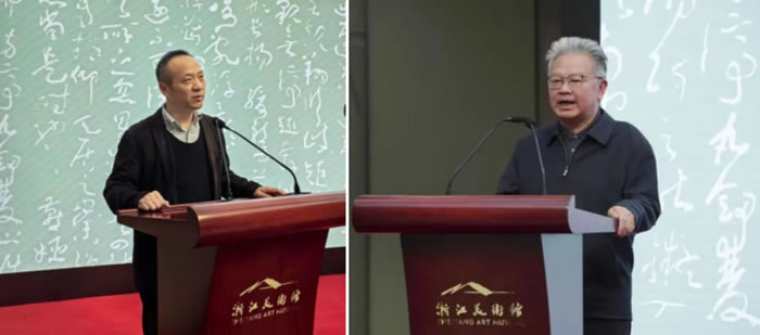 書法家張智重(左)致答謝詞;浙江省人大常委會(huì)原副主任劉力偉(右)宣布展覽開幕