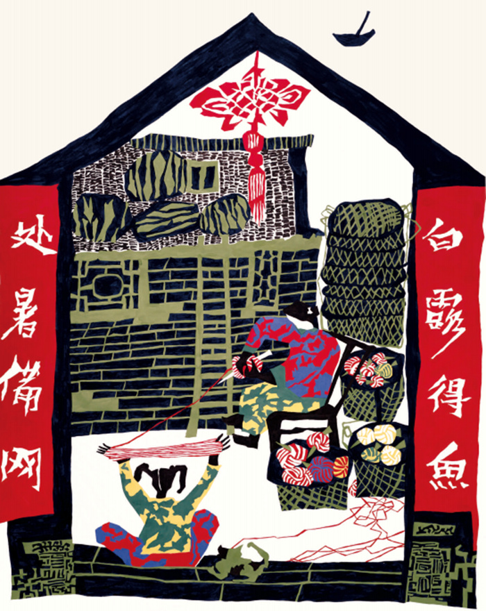 本次展覽以“海上的鄉(xiāng)土世界”為主題,共分“耕耘”“和美”“新曲”三個(gè)篇章。耕耘篇以“海上牧歌”為韻,26件作品將目光投向波濤之上的勞作與守望。作品以充滿本真之美的筆觸,將不同時(shí)空的勞動(dòng)場景巧妙并置,讓日常的漁業(yè)勞作升華為人與自然的精神對話,在平涂色塊間流淌著同舟共濟(jì)的淳美鄉(xiāng)風(fēng)。