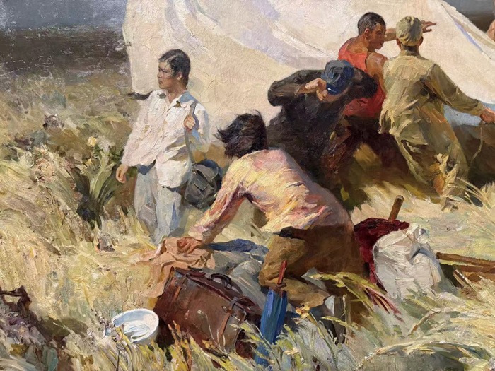 作為“馬訓班”最具感染力和代表性的作品之一,詹建俊的《起家》將時代命題與個人激情融為一體,在完美體現(xiàn)馬克西莫夫倡導的科學創(chuàng)作流程、嚴謹造型規(guī)律的同時,對敘事方式和構圖形式展開了更深入的個人思考。一來,比起同期描述歷史事件或英雄人物作品多采用的直白敘事方式,詹建俊放棄了對“青年墾荒隊”日常勞動的具體場景,而是捕捉了一個更戲劇性的瞬間:暴風雨來臨之前,一群墾荒青年爭分奪秒,與狂風分離搏斗,努力固定帳篷。這個場景的選擇避免了刻板說教,將艱辛勞動與創(chuàng)業(yè)豪情濃縮為一個瞬間,將建設祖國的氣魄以更為浪漫的視覺語言表達出來。二來,“S”形構圖獨具匠心,動感十足——拉扯帆布的人群和被風掛起的帳篷帆布,以點和面結(jié)合的方式引導了觀眾按彎曲的動線進行觀看,仿佛感受到狂風呼嘯和青年們的力量。這既是詹建俊對蘇式油畫中現(xiàn)實主義“戲劇瞬間”的沿襲,也是個人風格的充分發(fā)揮。