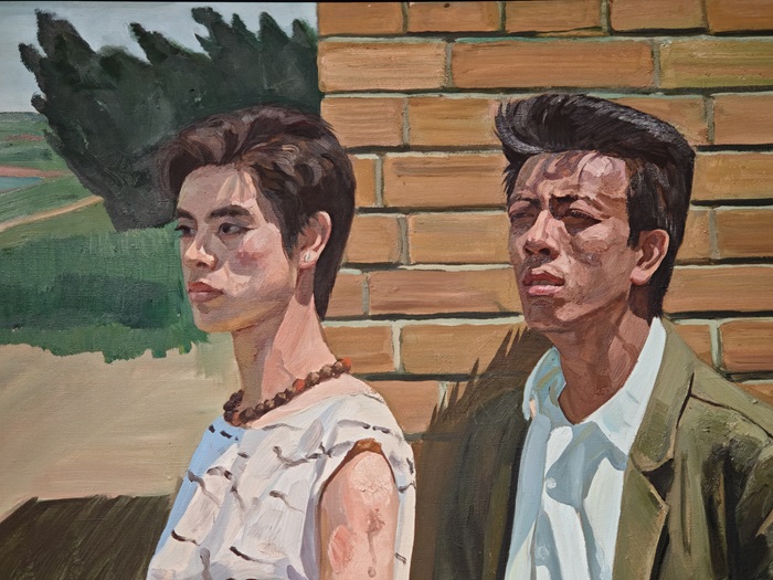 《田園牧歌》是他“新生代”階段的重要代表作。畫中劉小東和喻紅在陽光下并肩站立,斜倚著墻壁,看向遠方,男主人公瞇起了眼,眉頭微皺。作品就像電影的長鏡頭,把一秒鐘盡可能拉長,展開生活中的空白部分,訴說著愛情中的點滴狀態(tài)。