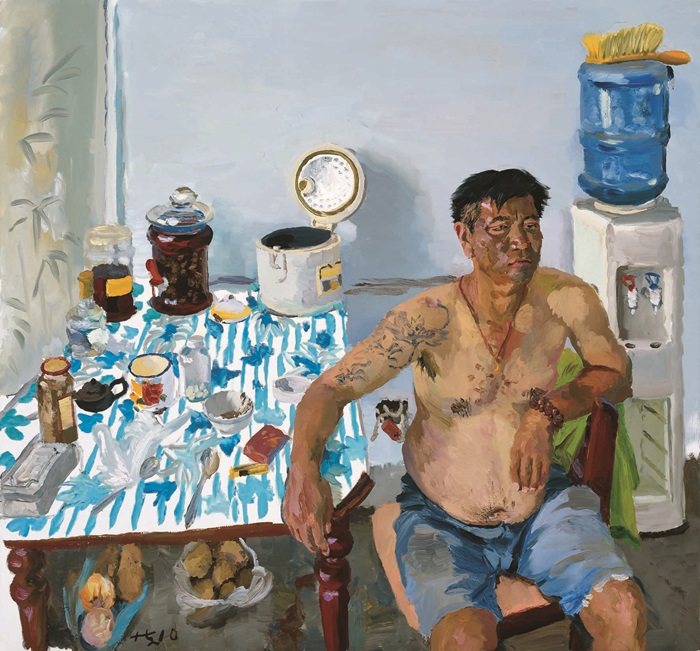 作品中經(jīng)常出現(xiàn)有象征意義的物品,用策展人的話來說,總有一些元素打破畫面中的平衡,為畫面注入獨特的意味,強化了人物的內(nèi)心活動。這一手法也貫穿了他之后的創(chuàng)作。比如《休息》中腳下的電爐、《心亂的男孩》桌子上雜亂的顏料與藥品。劉小東的繪畫構(gòu)建了獨特的精神世界。