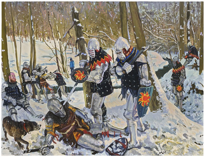 在2025年的新作中,他又去了底特律這座曾經(jīng)輝煌的“鋼鐵之城”?!兜滋芈裳┕狻肥且粓鲅b扮游戲,是寒冬中的戰(zhàn)斗,是對中世紀的模仿,他們把身體隱藏在保護之下,整幅畫只有一張露出的臉。他覺得油畫是一種古典的媒介,很適合畫金屬。他還用多層敘事表現(xiàn)事件的推移。《天門關(guān)》展現(xiàn)了太行山區(qū)新一代青少年的形象。他改變以前印象派的色彩體系,轉(zhuǎn)而表現(xiàn)主觀的固有色,但他仍然展示出控制色彩關(guān)系的強大能力,洋溢著青春感。